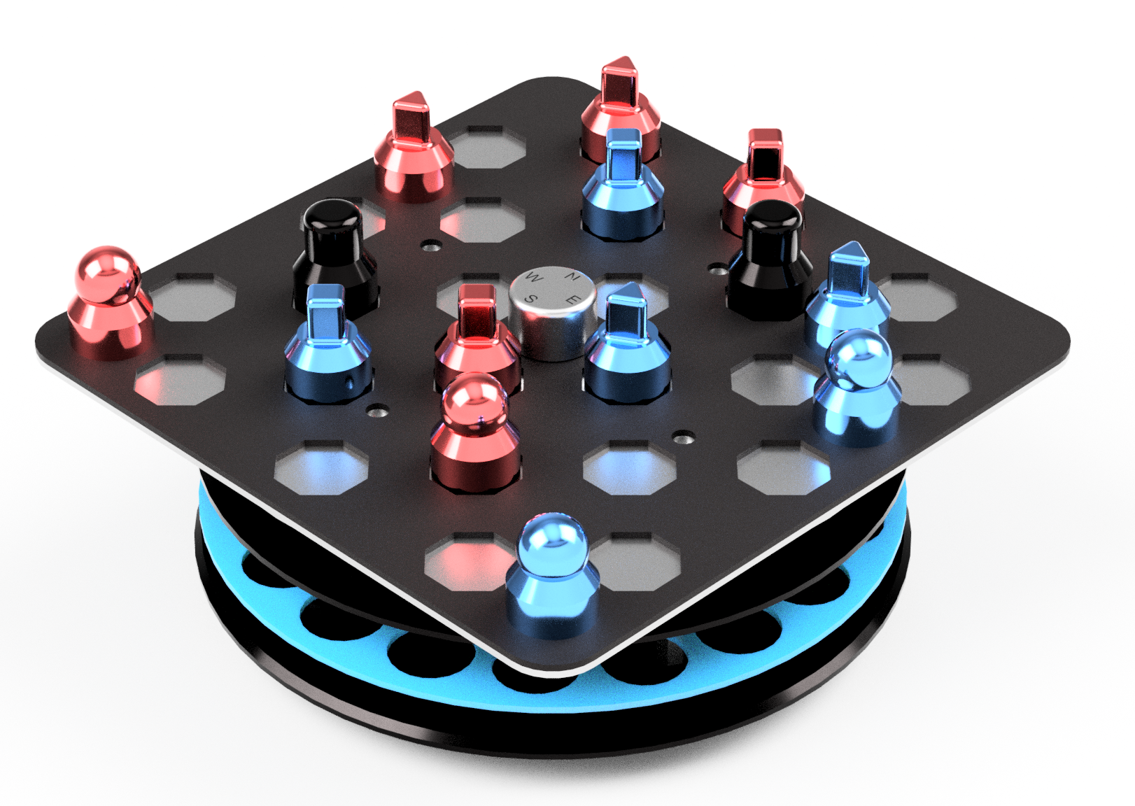 The board is a 7x7 grid with a rotary marker occupying the centre position. The rotary marker has the four compass points which are a key aspect of the game.